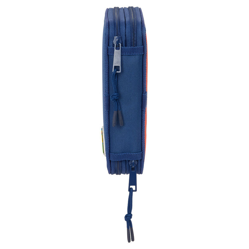 Tamaño: 12,5x4x19,5cm. Contiene 29 piezas : goma, lápiz de grafito, bolígrafo azul-rojo, y sacapuntas (primer compartimento) 10 colorines de madera, y 14 rotuladores de colores (segundo compartimento).