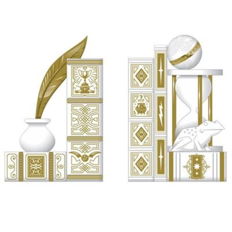 Conjunto de 2 sujetalibros de metal blanco con símbolos icónicos del Mundo Mágico, medidas 15,2 x 22,9 x 30,5 cm.